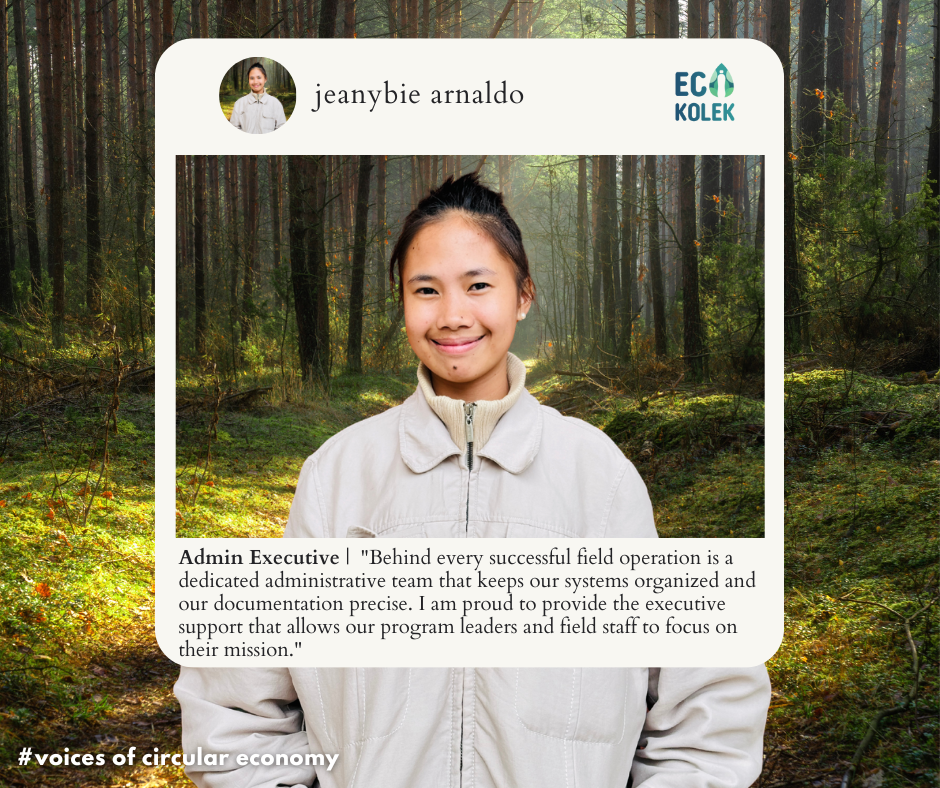 As part of our "Voices of Circular Economy" series, Eco Kolek is proud to introduce Jeanybie Arnaldo, our dedicated Admin Executive. Jeanibie plays a pivotal role in ensuring the smooth operation of Eco Kolek’s day-to-day activities, keeping our systems organized and allowing the entire team to focus on creating a lasting impact through sustainability.