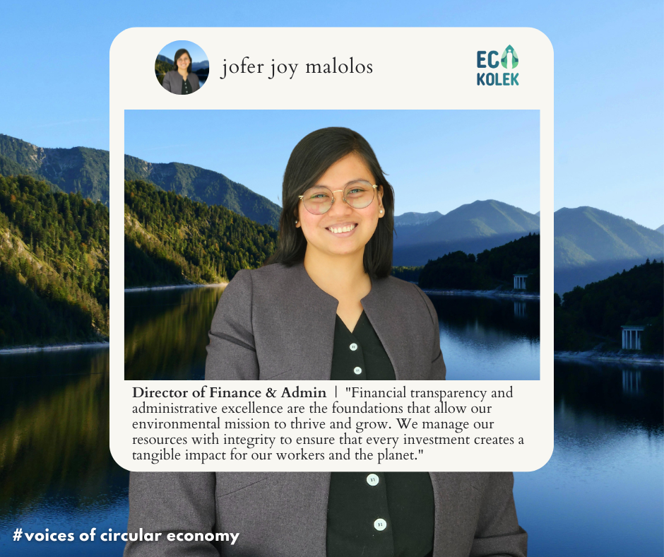 As part of our "Voices of Circular Economy" series, Eco Kolek is excited to introduce Jofer Joy Malolos, our new Director of Finance & Admin. A founder of Project Zacchaeus, Jofer brings a wealth of experience from various industries, including construction, entertainment, food and beverage, and social services. With a background in finance, Jofer is now focused on ensuring that Eco Kolek’s financial resources are managed efficiently and transparently, laying a strong foundation for the organization’s ongoing efforts to combat plastic pollution and promote sustainable waste management.