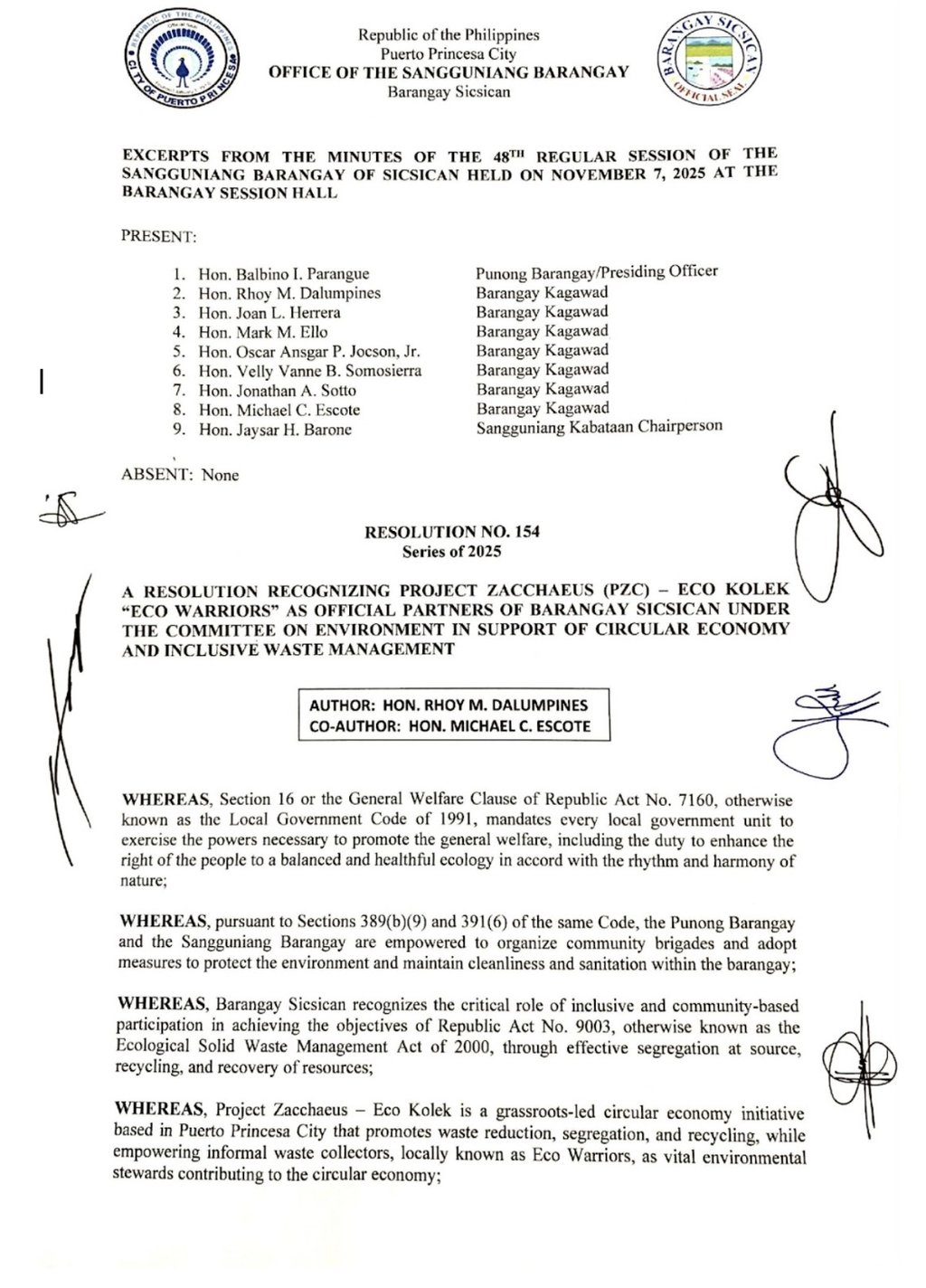 Co-authored by Barangay Councilors Rhoy M. Dalumpines and Michael C. Escote, the resolution designates the Eco Warriors—informal waste collectors organized under the Eco-Kolek program—as key allies of the Committee on Environment of Barangay Sicsican, Puerto Princesa City. This legislative action aligns with the Local Government Code of 1991, which mandates barangays to promote general welfare and ecological protection.