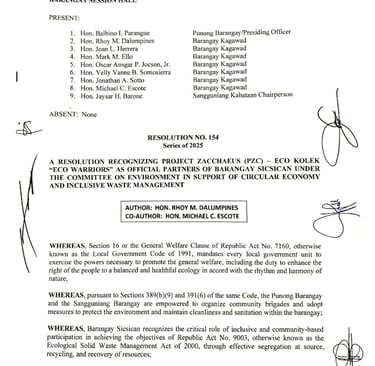 The Sangguniang Barangay of Sicsican has formally recognized the Eco Warriors of Project Zacchaeus (PZC) as official partners in the barangay's solid waste management and circular economy initiatives. The recognition was formalized through Resolution No. 138, Series of 2025, enacted during the council's 48th Regular Session on November 7, 2025.